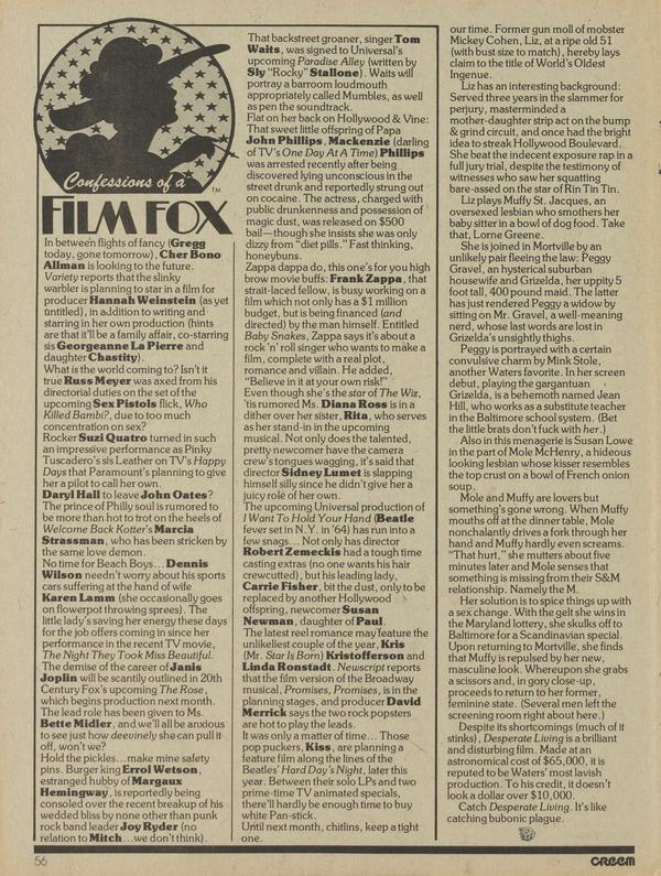 by John Waters, whose latest film Desperate Living opened in New York recently to a typical Waters crowd, a collection of bizarros and well-to-do thrill slummers that looked like an issue of Interview magazine out for an evening on the town, laughs a lot.