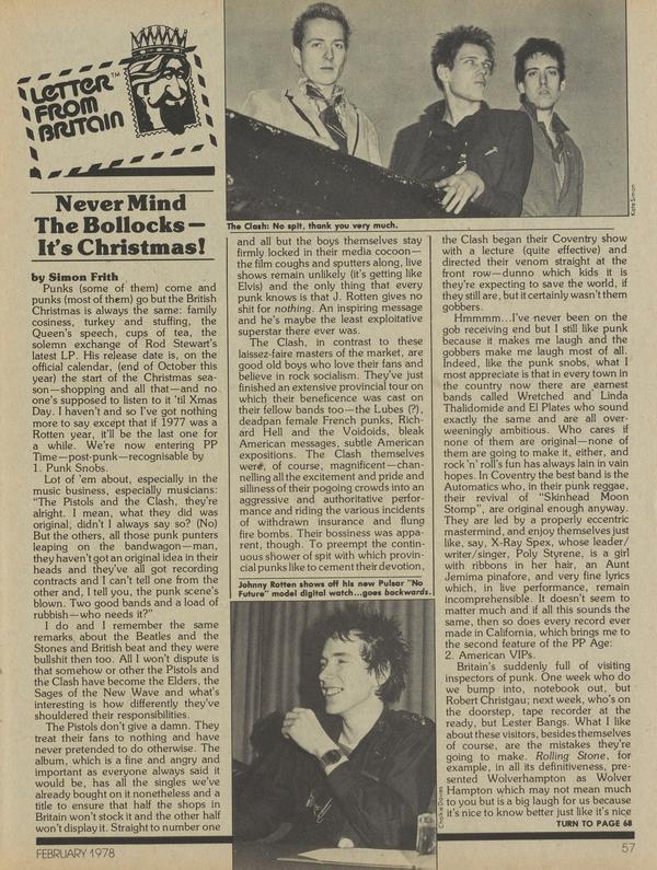 Let's face it gang—with the Sex Pistols album now officially out and in the stores, we have reached the critical point in the 70's punk movement, probably for both the American as well as the British scene. The two don't really share that much beyond an unrelenting dissatisfaction with things as they are, with the U.S. side a bit more just plain musically sick of what's goin' down and the U.K.'ers more socio-politically concerned.