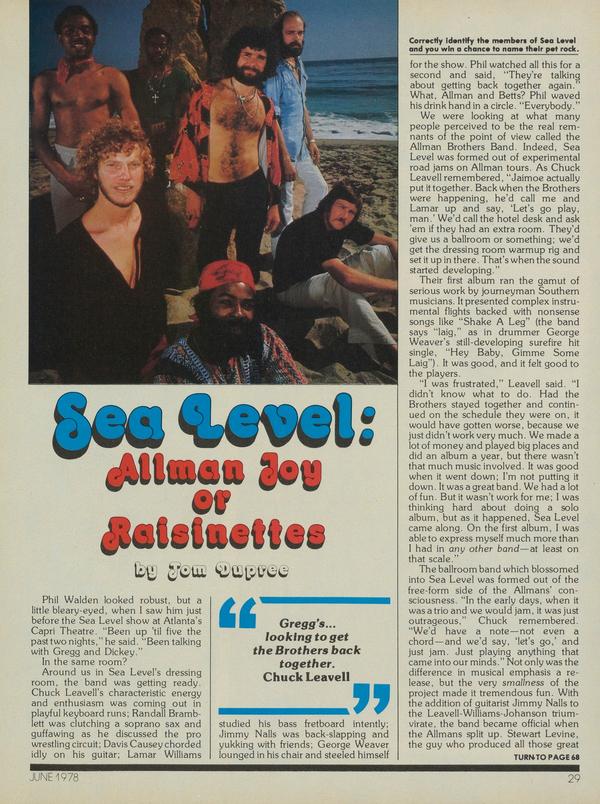 Phil Walden looked robust, but a little bleary-eyed, when I saw him just before the Sea Level show at Atlanta's Capri Theatre. "Been up 'til five the past two nights," he said. "Been talking with Gregg and Dickey." In the same room? Around us in Sea Level's dressing room, the band was getting ready.
