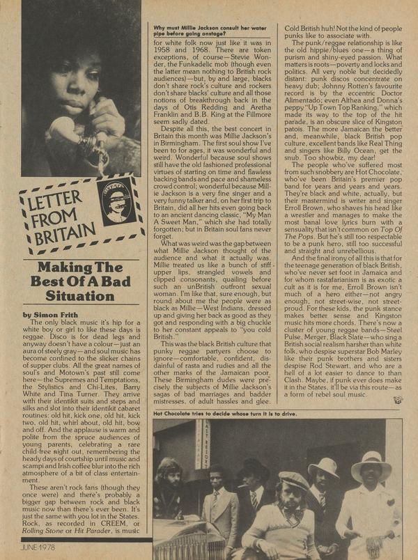 The only black music it's hip for a white boy or girl to like these days is reggae. Disco is for dead legs and anyway doesn't have a colour—just an aura of steely gray—and soul music has become confined to the slicker chains of supper clubs. All the great names of soul's and Motown's past still come here—the Supremes and Temptations, the Stylistics and Chi-Lites, Barry White and Tina Turner.