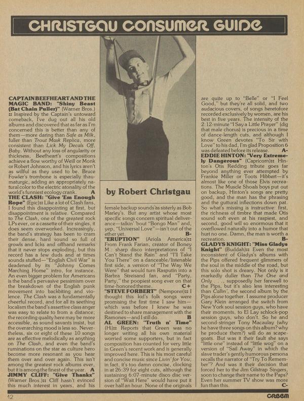 CAPTAIN BEEFHEART AND THE MAGIC BAND: “Shiny Beast (Bat Chain Puller)" (Warner Bros.) :: Inspired by the Captain’s untoward comeback, I’ve dug out all his old albums and discovered that as far as I’m concerned this is better than any of them—more daring than Safe as Milk, fuller than Trout Mask Replica, more consistent than Lick My Decals Off, Baby.