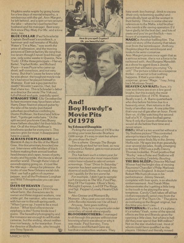 Three downer flicks in my top ten—Straight Time, Blue Collar, and Who’ll Stop The Rain, and two documentaries; you might say I've avoided the obvious this year. But if you'll recall, two bona fide ’78 hits — Saturday Night Fever and The Turning Point—qualified for 1977, no good for now.