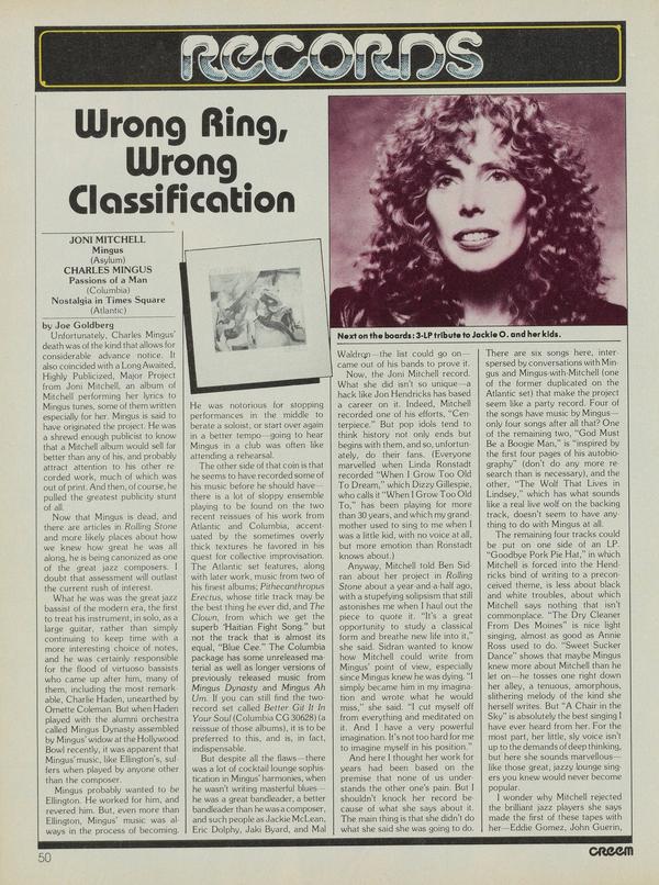 Unfortunately, Charles Mingus' death was of the kind that allows for considerable advance notice. It also coincided with a Long Awaited, Highly Publicized, Major Project from Joni Mitchell, an album of Mitchell performing her lyrics to Mingus tunes, some of them written especially for her.
