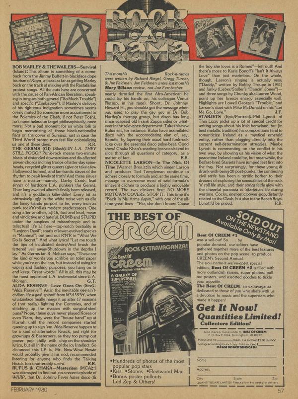 This months Rock-a-ramas were written by Richard Riegel, Gregg Turner, & Jim Feldman. Jim Feldman wrote last months Mary Wilson review, not Joe Fernbacher.
