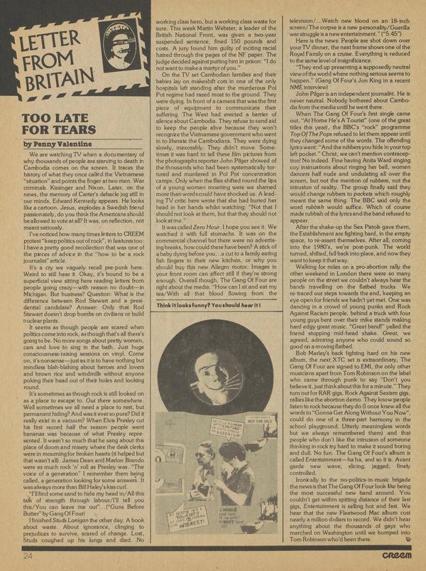 We are watching TV when a documentary of why thousands of people are starving to death in Cambodia comes on the screen.