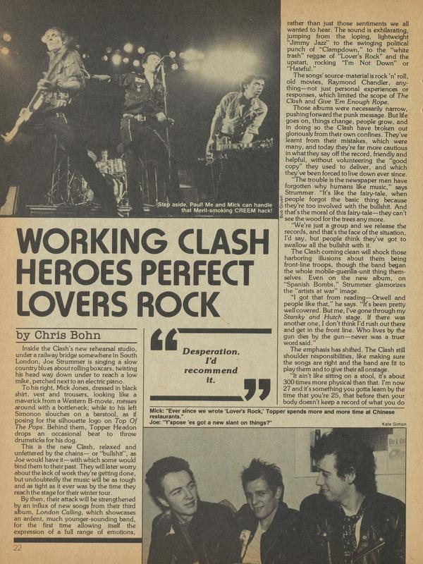 Inside the Clash’s new rehearsal studio, under a railway bridge somewhere in South London, Joe Strummer is singing a slow country blues about rolling boxcars, twisting his head way down under to reach a low mike, perched next to an electric piano.