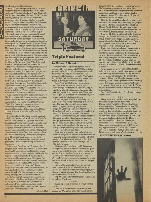 Director John Carpenter surprised a lot of people with Halloween, a $300,000 movie that grossed $50 million. With his eagerly awaited follow-up, The Fog, he won’t reverse the process, but he’s pressing his luck. The Fog is a high budget flick that deserves to go down the tubes, but everybody knows: fog floats.