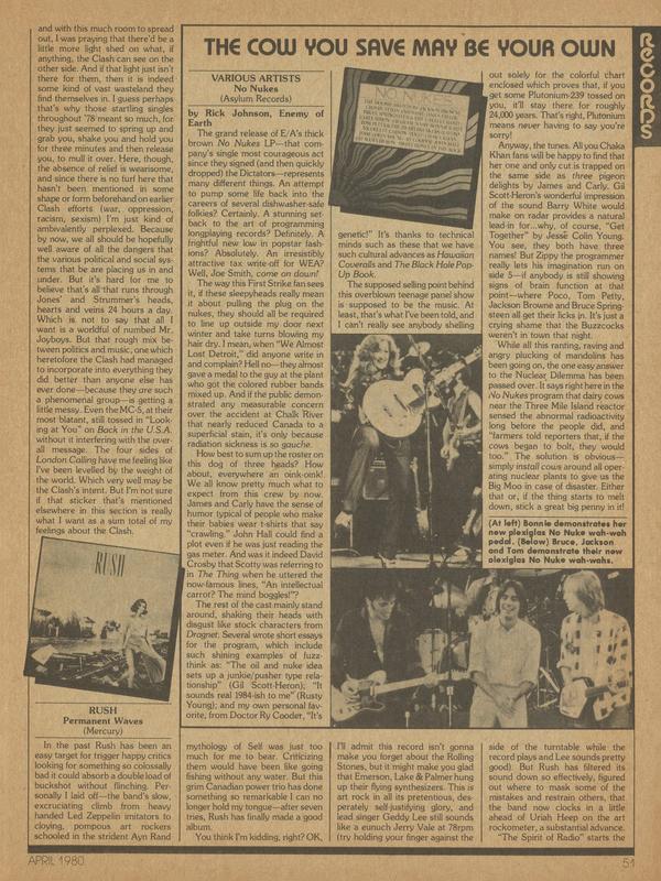 The grand release of E/A’s thick brown No Nukes LP—that company’s single most courageous act since they signed (and then quickly dropped) the Dictators—represents many different things. An attempt to pump some life back into the careers of several dishwasher-safe folkies? Certainly.