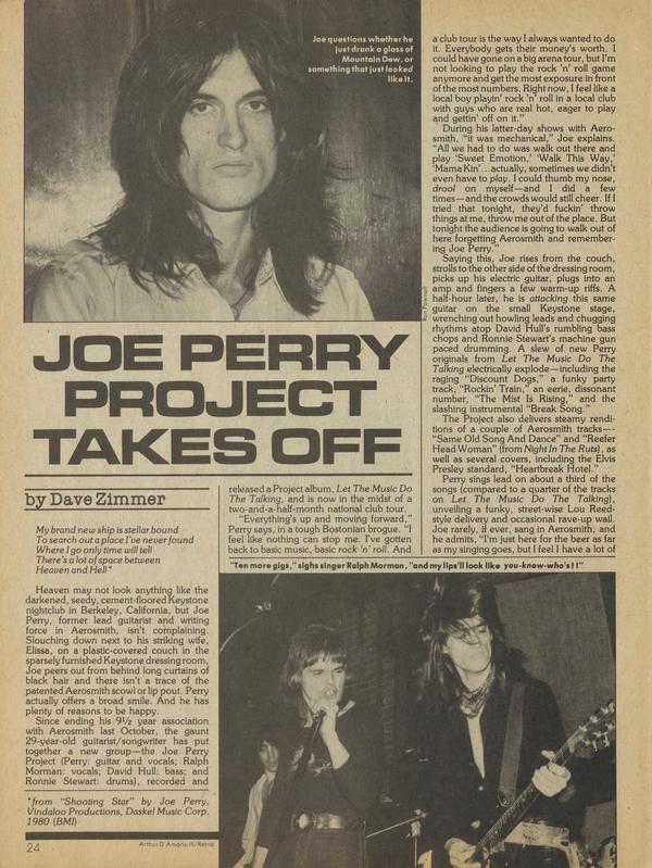 Heaven may not look anything like the darkened, seedy, cement-floored Keystone nightclub in Berkeley, California, but Joe Perry, former lead guitarist and writing force in Aerosmith, isn’t complaining. Slouching down next to his striking wife, Elissa, on a plastic-covered couch in the sparsely furnished Keystone dressing room, Joe peers out from behind long curtains of black hair and there isn’t a trace of the patented Aerosmith scowl or lip pout.