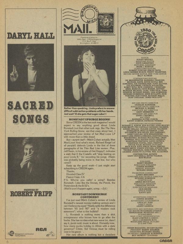 Since CREEM is the last rock magazine I would expect to say anything good about Linda Ronstadt (not that other rock rags, like The New York Rolling Stone, are that crazy about her), I approached your review of her Mad Love LP with more-than-a-little dread.