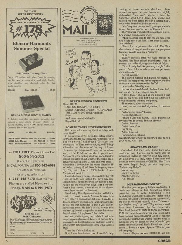 STARTLING NEW CONCEPT! Dear CREEM: ENCLOSED IS A PICTURE OF THE LATEST CRAZE!!! DANNY THOMAS AND THE CLASH! DIG THE FABNESS! From Ah Existor named Michael S. Royal Oak, MI SOMEMUTANTS NEVER GROW UP! Did I ever tell you about the time I slept with Bebe Buell?