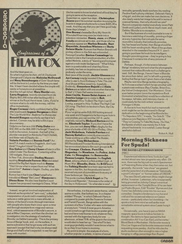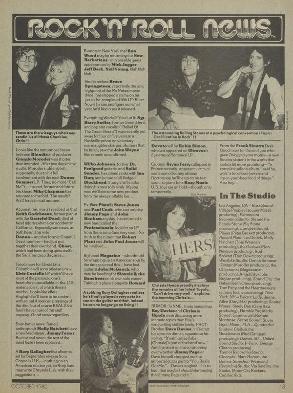 Looks, like the announced liason between Blondie and producer Giorgio Moroder was shorter than intended. After two days in the studio, Moroder suddenly left, supposedly due to his full involvement with the next Donna Summer LP. Thus, no more “Call Me’”s—instead, former and future brickhead Mike Chapman has returned to the fold.