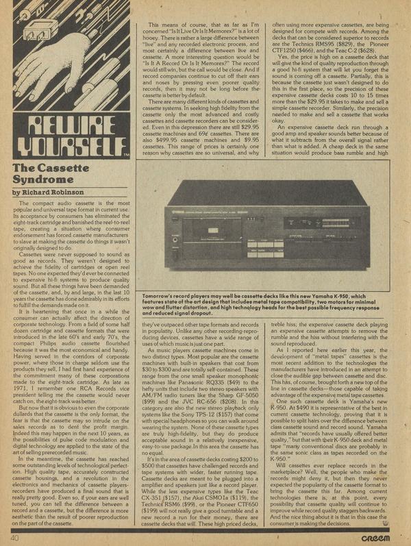 The compact audio cassette is the most popular and universal tape format in current use. Its acceptance by consumers has eliminated the eight-track cartridge and banished the reel-to-reel tape, creating a situation where consumer endorsement has forced cassette manufacturers to slave at making the cassette do things it wasn’t originally designed to do.