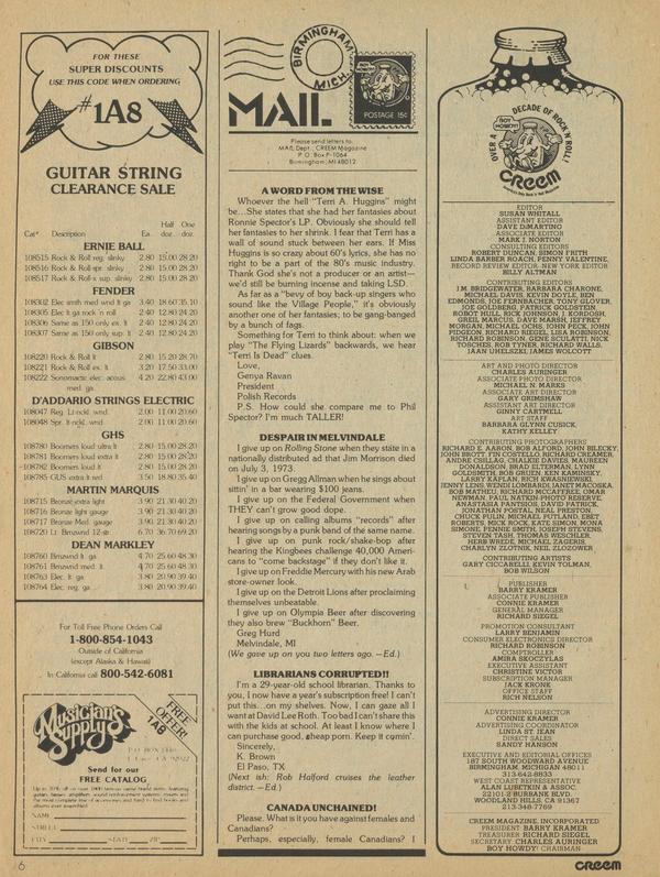 Whoever the hell “Terri A. Huggins” might be...She states that she had her fantasies about Ronnie Spector’s LP. Obviously she should tell her fantasies to her shrink. I fear that Terri has a wall of sound stuck between her ears. If Miss Huggins is so crazy about 60’s lyrics, she has no right to be a part of the 80’s music industry.