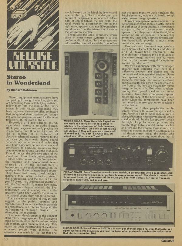 Stereo In Wonderland Stereo equipment manufacturers have stepped right through the looking glass and are beckoning those with bulging wallets to follow them into the land of the mirror image.