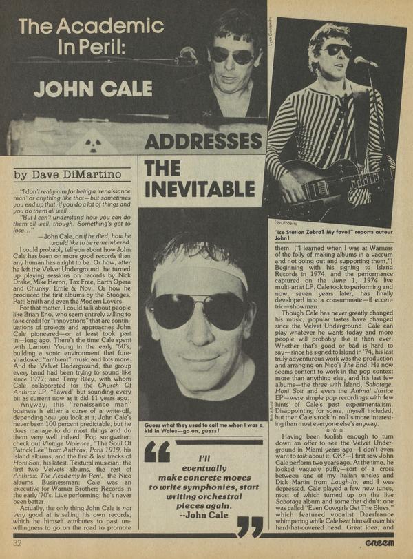 “I don’t really aim for being a ‘renaissance man’ or anything like that—but sometimes you end up that, if you do a lot of things and you do them all well... “But I can’t understand how you can do them all well, though. Something’s got to lose...” —John Cale, on if he died, how he would like to be remembered.