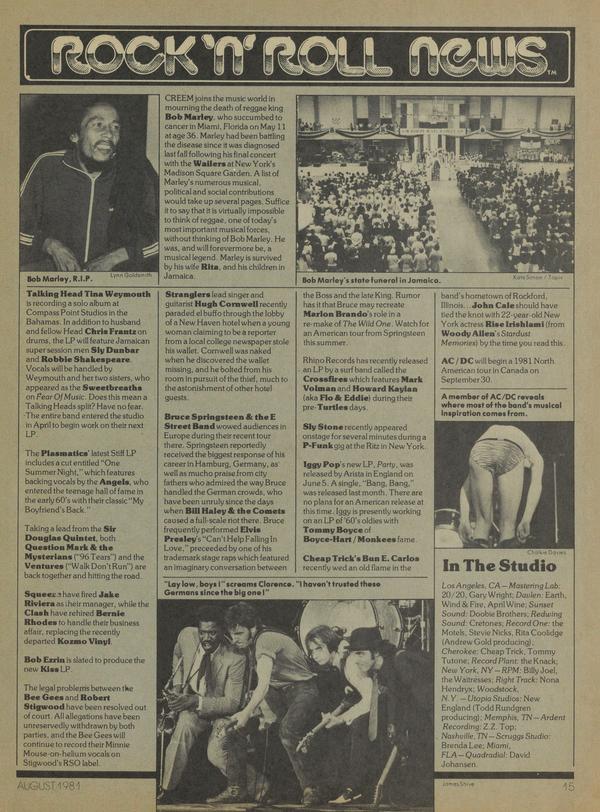 Talking Head Tina Weymonth is recording a solo album at CdmpassPoint Studios in the Bahamas, In addition to husband and fellow Head Chris Frants on drums, the LP will feature Jamaican super session men Sly Dunbar and Robbie Shakespeare, vocals will be handled by Weymouth and her two sisters, who appeared as the Sweatbreaths on Pear Of Music, Does this mean a Talking Heads split? Have no fear.