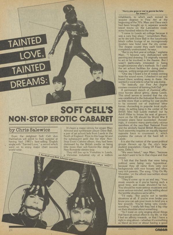 Even the delighted Soft Cell duo themselves will admit to their surprise at having had 1981s best-selling English singly with Tainted Love," a record which went on to enjoy major chart success world-wide. Its been a major victory for singer Marc Almond and synthesizer player Dave Ball,