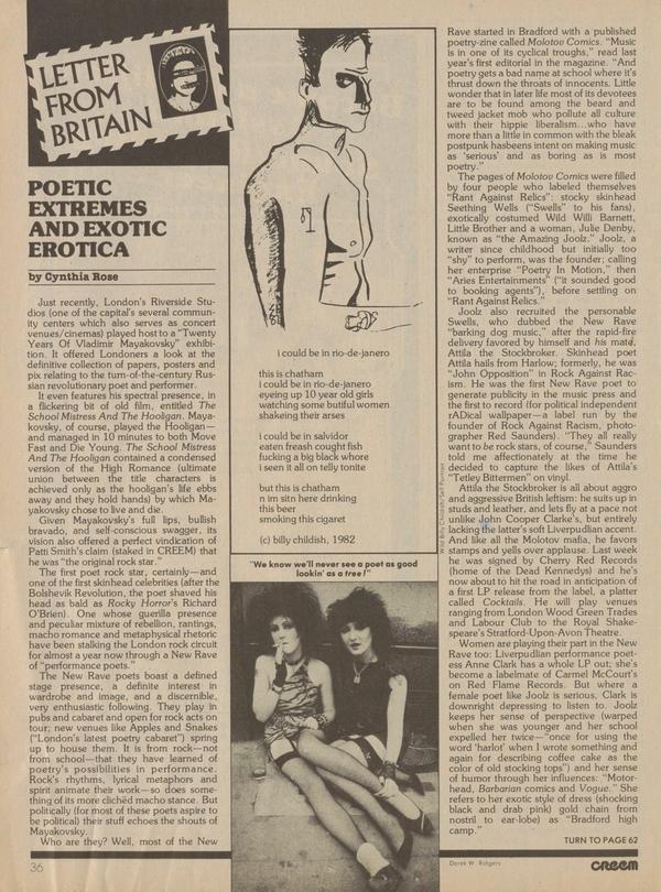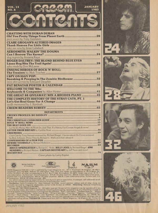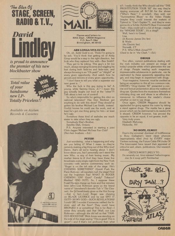 Please send letters to: MAIL Dept., CREEM Magazine P.O. Box P-1064 Birmingham, Ml 48102 ARS LONGA VITA ELVIS Oh, oh. Solid Gold is on. Think I’m going to be sick. You’d think that getting rid of Andy Gimp would be a step in the right direction, but look who they replaced him with—Rex Smith!!
