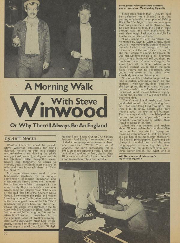 Winston Churchill would be proud. Steve Winwood apologizes for being delayed, motions us both into equally uncomfortable chairs (leaving the plush one graciously vacant), and gives me his full attention. Polite, thoughtful, clearheaded and forthright, he seems to embody qualities of Englishness that are far older and more honorable than the “Falkland Spirit.”