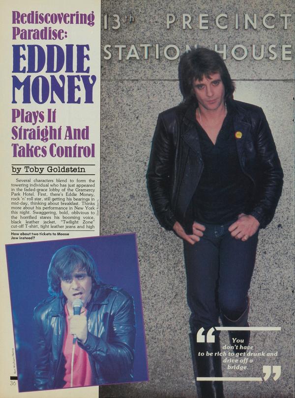 Several characters blend to form the towering individual who has just appeared in the faded-grace lobby of the Gramercy Park Hotel. First, there's Eddie Money, rock 'n' roll star, still getting his bearings in mid-day, thinking about breakfast. Thanks more about this performance in New York this night. Swaggering, bold, oblivious to the horrified stares his booming voice, black leather jacket, “Twilight Zone” cut-off T-shirt, tight leather jeans and high How about two tickets to Moose Jaw instead?