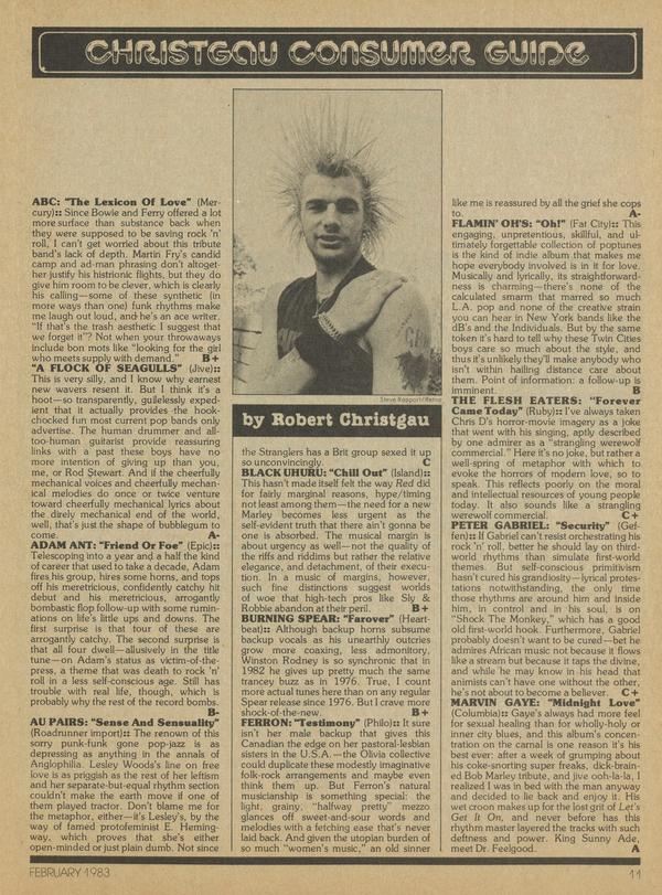 ABC: "The Lexicon Of Love" (Mercury):: Since Bowie and Ferry offered a lot more surface than substance back when they were supposed to be saving rock ’n’ roll, I can’t get worried about this tribute band’s lack of depth. Martin Fry’s candid camp and ad-man phrasing don’t altogether justify his histrionic flights, but they do give him room to be clever, which is clearly his calling—some of these synthetic (in more ways than one) funk rhythms make me laugh out loud, and he’s an ace writer.