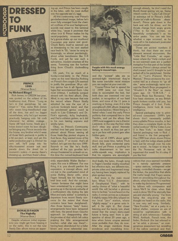 Rick James, in CREEM last year, was quoted on the subject of his funkbunny rival, Prince: 'Long as he's in that pantyhose, he can forget it.' Yep, same Rick James who wears 'long-dreadlocked wigs all the time, but ain't no faggot nevertheless, why he's got women practically hanging onto his cock whenever he strides onstage...