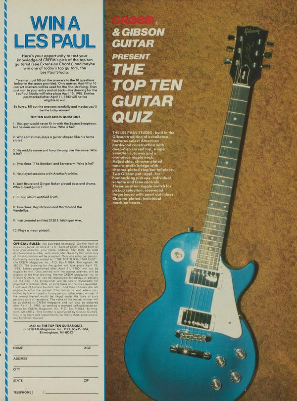 Here's your opportunity to test your knowledge of CREEM's pick of the top ten guitarist (see Extension Chords) and maybe win one of today's top guitars, the Les Paul Studio. To enter, just fill out the answers to the 10 questions below in the space provided.