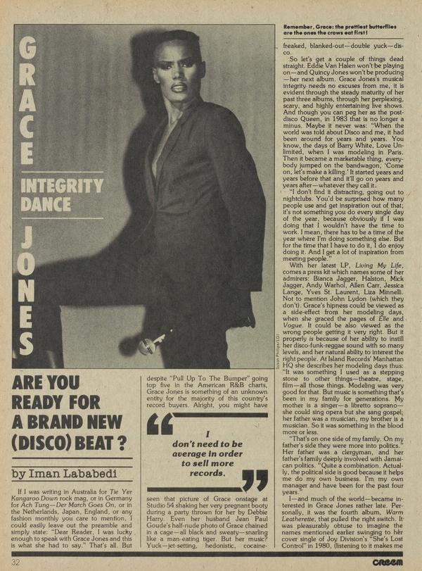 If I was writing in Australia for Tie Yer Kangaroo Down rock mag, or in Germany for Ach Tung—Der March Goes On, or in the Netherlands, Japan, England, or any fashion monthly you care to mention, I could easily leave out the preamble and simply state: “Dear Reader, I was lucky enough to speak with Grace Jones and this is what she had to say."