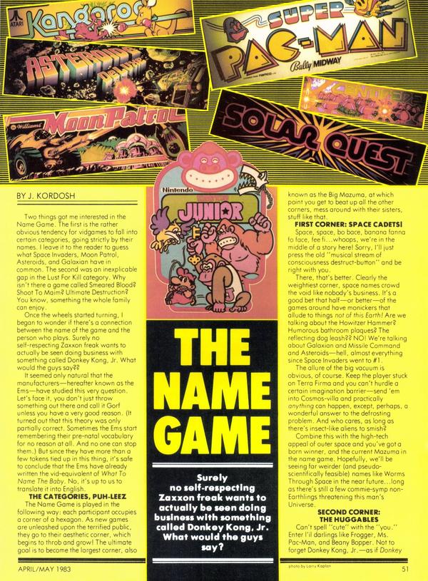 Two things got me interested in the Name Game. The first is the rather obvious tendency for vidgames to fall into certain categories, going strictly by their names. I leave it to the reader to guess what Space Invaders, Moon Patrol, Asteroids, and Galaxian have in common.