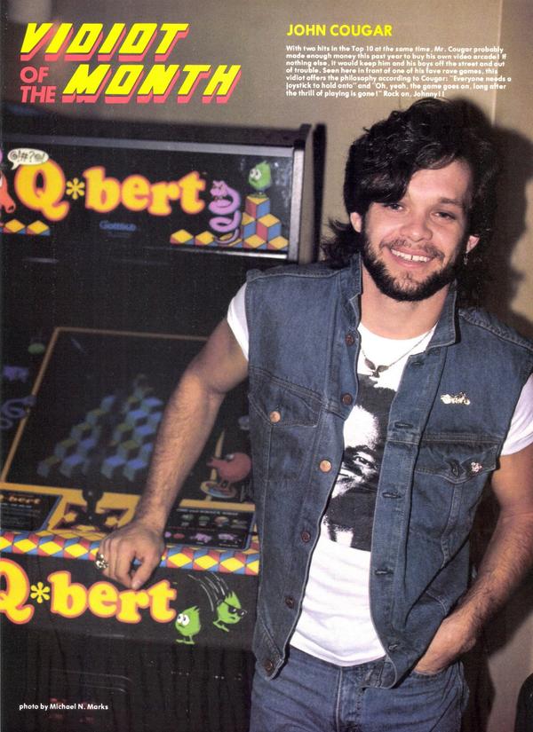 With two hits in the Top 10 at the same time, Mr. Cougar probably made enough money this post year to buy his own video arcade ! If nothing else, it would keep him and his boys off the street and out of trouble. Seen here in front of one of his fave rave games, this vidiot offers the philosophy according to Cougar: "Everyone needs a joystick to hold onto" and "Oh, yeah, the game goes on, long after the thrill of playing is gone !"