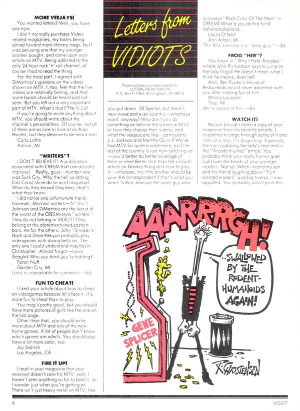 MORE VEEJA YS! You wanted letters? Well, you have one now. I don't normally purchase Videorelated magazines, my tastes being aimed toward more literary mags, but I was perusing one that my younger brother bought, and came upon your article on MTV.