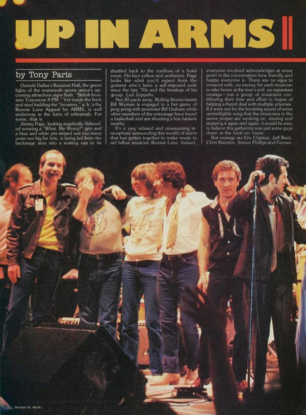 Outside Dallas’s Reunion Hall, the green lights of the mammoth sports arena’s upcoming attractions signs flash: “British Invasion Tomorrow 8 PM.” Yet inside the brick and steel building the “Invasion,” a/k/a the Ronnie Lane Appeal for ARMS, is well underway in the form of rehearsals.