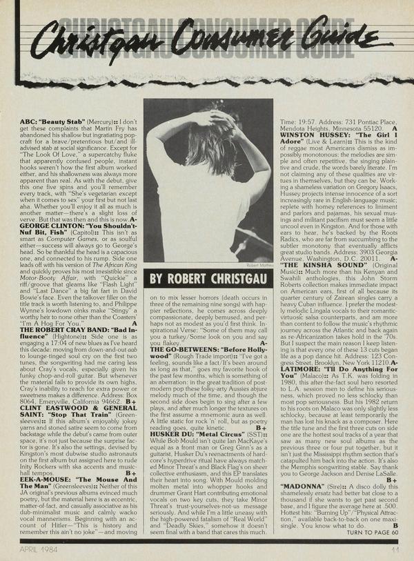 ABC: “Beauty Stab” (Mercury):: I don’t get these complaints that Martin Fry has abandoned his shallow but ingratiating pop-craft for a brave/pretentious but/and ill-advised stab at social significance. Except for “The Look Of Love,” a supercatchy fluke that apparently confused people, instant hooks weren’t how the first album worked either, and his shallowness was always more apparent than real.