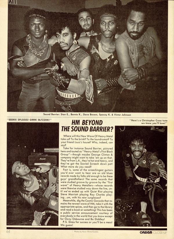 Where will this New Wave Of Heavy Metal take us? To the brink? To the laundromat? To your friend Louis's house? Who, indeed, can say? Take for instance Sound Barrier, pictured here and touted as "Heavy Metal's First Black Group"—though maybe George Clinton & company might want to take 'em up on that.