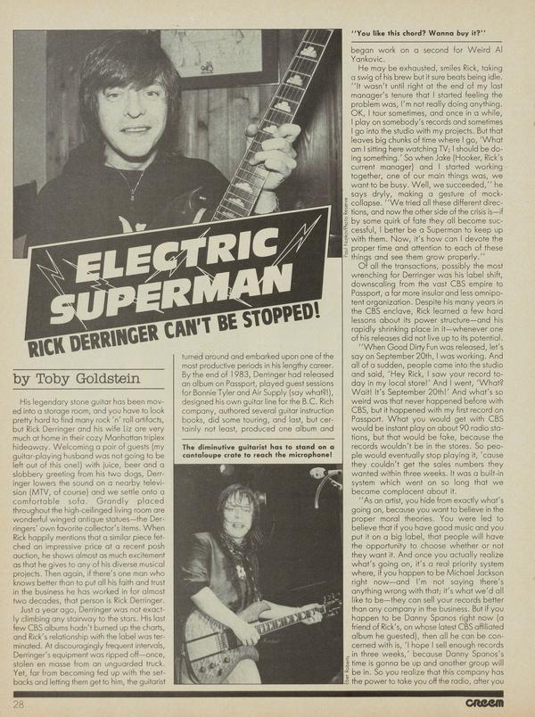 His legendary stone guitar has been moved into a storage room, and you have to look pretty hard to find many rock 'n' roll artifacts, but Rick Derringer and his wife Liz are very much at home in their cozy Manhattan triplex hideaway. Welcoming a pair of guests (my guitar-playing husband was not going to be left out of this one!) with juice, beer and a slobbery greeting from his two dogs, Derringer lowers the sound on a nearby television (MTV, of course) and we settle onto a comfortable sofa.