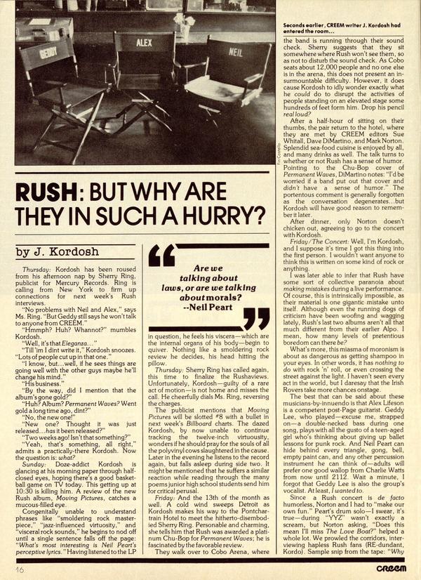 Thursday: Kordosh has been roused from his afternoon nap by Sherry Ring, publicist for Mercury Records. Ring is calling from New York to firm up connections for next week’s Rush interviews. “No problems with Neil and Alex,” says Ms. Ring. “But Geddy still says he won’t talk to anyone from CREEM.”
