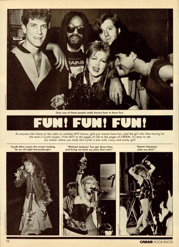 As anyone who listens to the radio or watches MTV knows, girls just wanna have fun—and the girl who likes having fun the most is Cyndi Lauper. From MTV to the pages of Life to the pages of CREEM, it's easy to see (no matter where you look) that Cyndi is one wild, crazy and wooly girl!