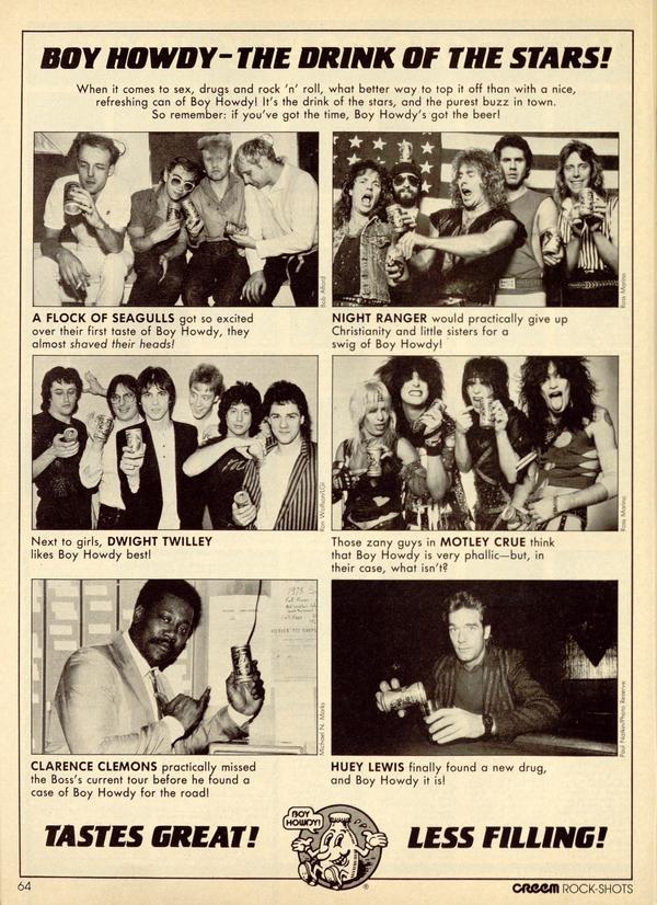 When it comes to sex, drugs and rock 'n' roll, what better way to top it off than with a nice, refreshing can of Boy Howdy! It's the drink of the stars, and the purest buzz in town. So remember: if you've got the time, Boy Howdy's got the beer!