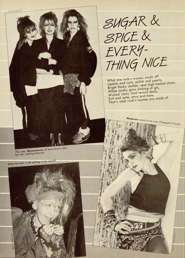 What are rock's women made of? Lipstick and curls, polish and pearls, Bright flashy clothes, neat high-heeled shoes, White toothy grins stinking of gin, Wicked ideas, bad record deals, Evil and spite, envy and hate. That's what rock's women are made of.