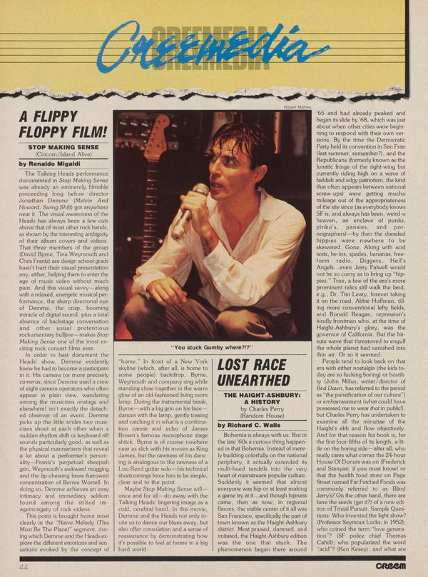 The Talking Heads performance documented in Stop Making Sense was already an eminently filmable proceeding long before director Jonathan Demme (Melvin And Howard, Swing Shift) got anywhere near it. The visual awareness of the Heads has always been a few cuts above that of most other rock bands, as shown by the interesting ambiguity of their album covers and videos.