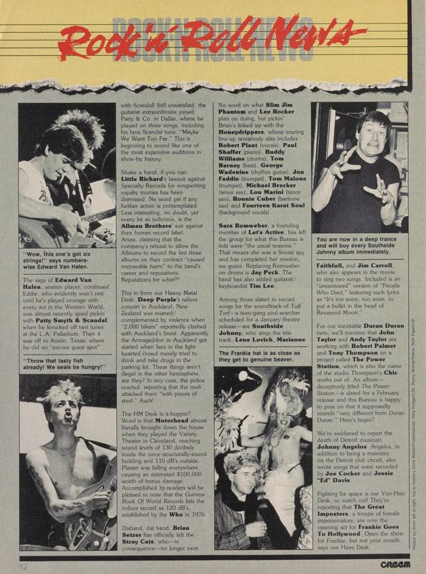 The saga of Edward Van Halen, session player, continues! Eddie, who evidently won’t rest until he’s played onstage with every act in the Western World, was almost recently spied pickin’ with Patty Smyth & Scandal, when he knocked off two tunes at the L. A. Palladium.