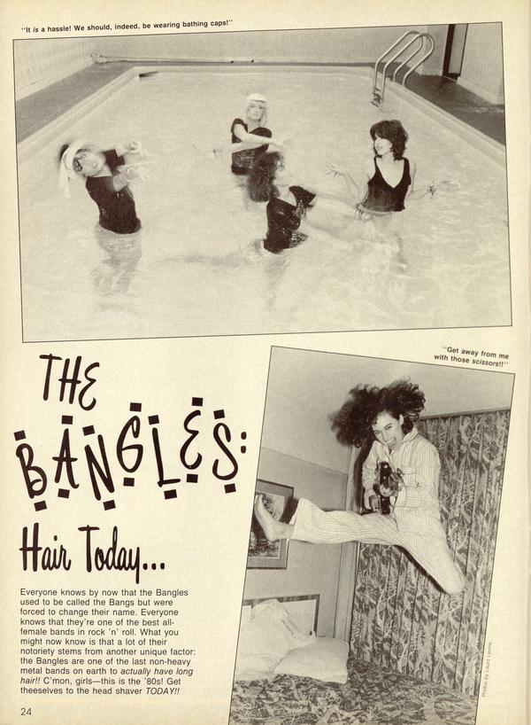Everyone knows by now that the Bangles used to be called the Bangs but were forced to change their name. Everyone knows that they’re one of the best allfemale bands in rock ’n’ roll. What you might now know is that a lot of their notoriety stems from another unique factor: the Bangles are one of the last non-heavy metal bands on earth to actually have long hair!!