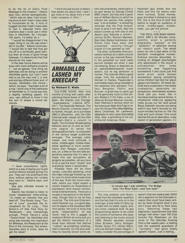 CULTURE KICKS: After nine months of living with cable, after watching liberal doses of CNN, CSpan, the Atlantic and Chicago �superstations,� Lifetime, MTV, VH-1, The Nashville Network, The Movie Channel, Cinemax (wasn�t so foolish, though, as to purchase HBO or Showtime...yet), the USA Channel (well, maybe not the USA Channel—that�s a column in itself), The Christian Broadcasting Network and so on and so forth, one begins to sense the demographics here—a composite of the various target audiences emerges.