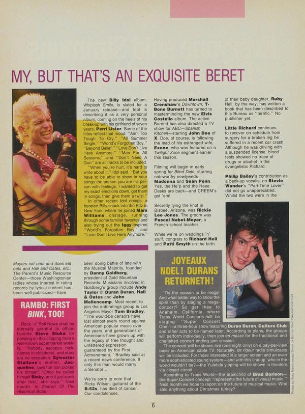 The new Billy Idol album, Whiplash Smile, is slated for a January release—and Idol is describing it as a very personal album, coming on the heels of his break-up with his girlfriend of seven years, Perri Lister. Some of the titles reflect that mood: