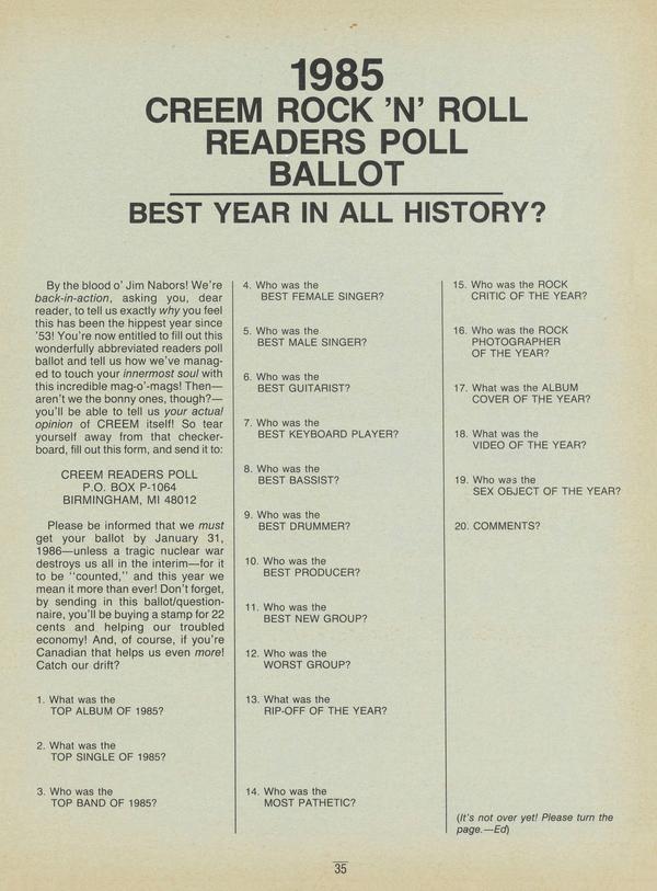 1985 CREEM ROCK N ROLL READERS POLL BALLOT