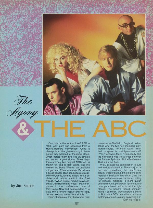 Can this be the look of love? ABC in 1985 look more like escapees from a Hanna-Barbera convention. Quite a change from the glamorous gold lame get-up they adopted for the debut elpee, which netted them two Top 20 singles and (wow!) a gold album.
