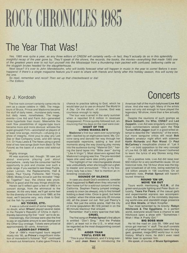 Yes, 1985 was quite a year, as any three editors of CREEM will certainly verify—in fact, they’ll actually do so in this splendidly insightful recap of the year gone by. They’ll speak of the shows, the records, the books, the movies—everything that made 1985 one of the greatest years ever to not hurl yourself into the Mississippi from a thundering train packed with confused, bellowing cattle as the sluggish brutes headed for the slaughterhouse.