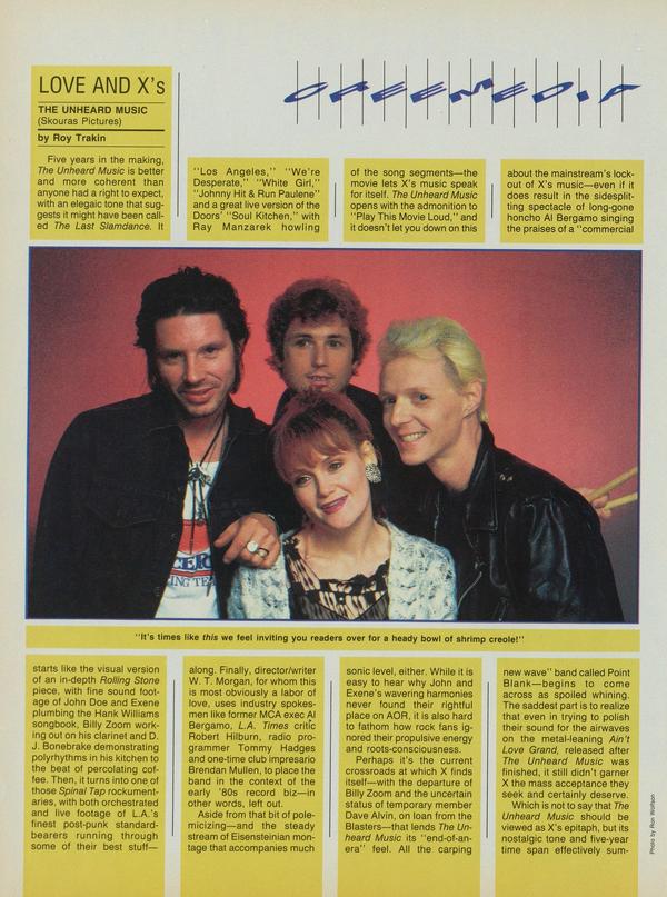 Five years in the making, The Unheard Music is better and more coherent than anyone had a right to expect, with an elegaic tone that suggests it might have been called The Last Slamdance. It starts like the visual version of an in-depth Roiling Stone piece, with fine sound footage of John Doe and Exene plumbing the Hank Williams songbook, Billy Zoom working out on his clarinet and D. J. Bonebrake demonstrating polyrhythms in his kitchen to the beat of percolating coffee.