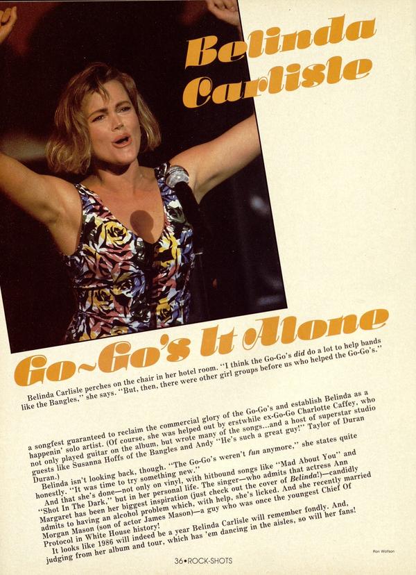 Belinda Carlisle perches on the chair in her hotel room. "I think the Go-Go's did do a lot a help bands like the Bangles," she says. "But, then were other girl groups before us who helped the Go-Go's." a songfest guaranteed to reclaim the commercial glory of the Go-Go's and establish Belinda as a happenin' solo artist.